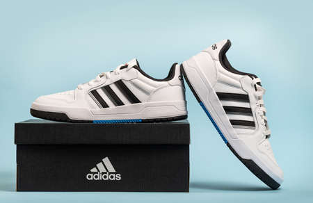 Belgrade, Serbia - May 11, 2022. New Adidas tennis shoes on white background with package box. New Adidas Sneakers or trainers on blue background. Men's sport footwear