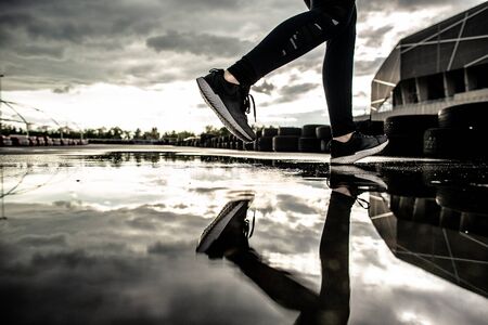 Sports background. Strong athletic legs of a woman runner in motion. Woman doing cardio workout outdoors after rain.