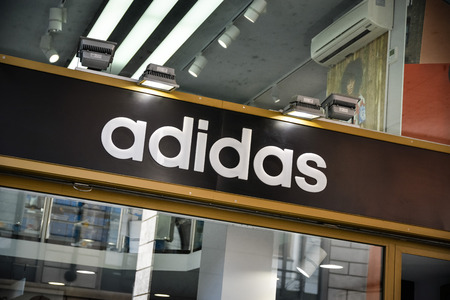 Barcelona, Spain - June 7, 2018: Logo and sign of Adidas at store in Barcelona