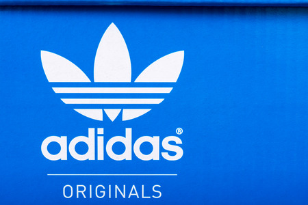 BUCHAREST, ROMANIA - JULY 23, 2014 Adidas Sign On Adidas Shoe Box Founded in 1924 is a German multinational corporation that designs and manufactures sports shoes, clothing and accessories
