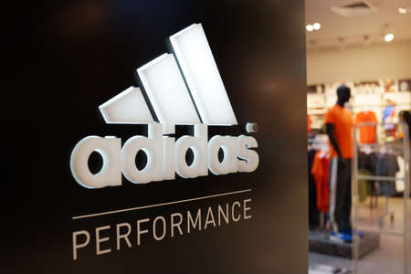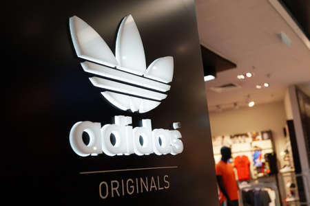PENANG, MALAYSIA - 12 MARCH 2017: A sign for an Adidas retail store in shopping mall Penang, Adidas is a German corporation that designs footwear and clothing.