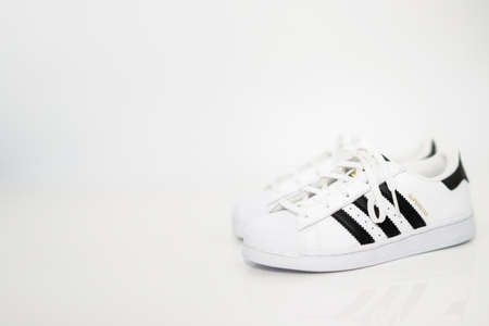 bangkok,Thailand,July 2,2021-original adidas sneakers shoes with shoelace on white floor side view soft focus with copy space