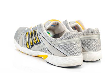 Pair of gray running shoes isolated on white background.