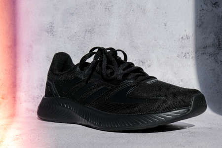 Kiev Ukraine - October 2021 Black Adidas Running boots. Multinational company. Product shots. Adidas swift run shoes for running for woman - illustrative editorial. Unisex for women and men