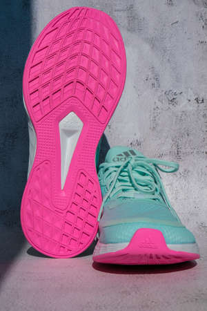 Kiev Ukraine - October 2021 New fashionable modern Blue and Pink Adidas Running boots. Product shots. Adidas swift run shoes for running for woman - illustrative editorial