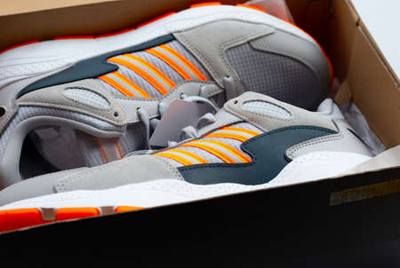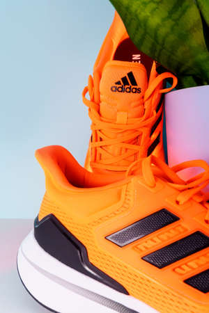 Tyumen, Russia-November 13, 2021: Orange adidas Running Shoes. Adidas , multinational company.