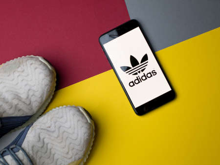USA - May, 2020; Adidas Iphone Application Screen with adidas shoes on colored paper background.