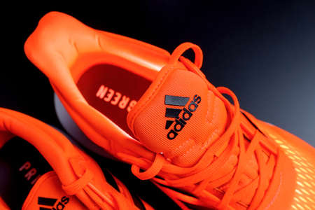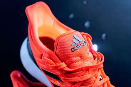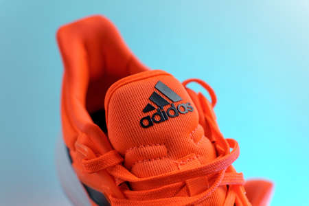 Tyumen, Russia-November 13, 2021: Adidas on orange running shoes close-up. Selective focus