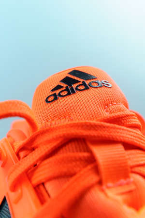 Tyumen, Russia-November 13, 2021: New orange color adidas sneakers. Logo close-up. copy space