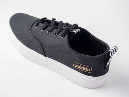 05/01/2021 Russia, Moscow. Close-up of black Adidas canvas sneakers isolated on a white background. Prokukt shot, side view