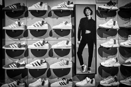 Bordeaux, France - January 14, 2024: Store wall with large group of sneakers, sport shoes