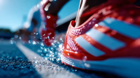 Close-up of red running shoes hitting the ground with water splashes, symbolizing speed, energy, and athletic performance.