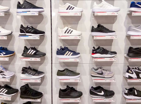 Kyiv, Ukraine - August 16, 2020: Adidas superstar white and black shoes and Nike sneakers at popular fashion store EpiCentre at Kyiv, Ukraine on August 16, 2020.