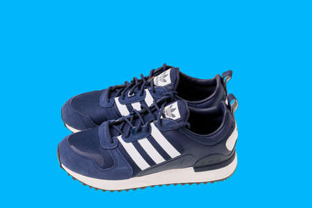 Close up view of blue adidas sneakers isolated on blue background. Sweden. uppsala. 06/05/2022.