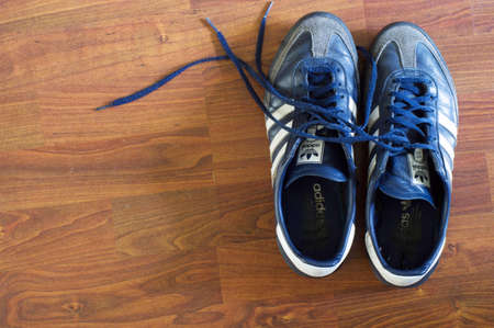 Arnhem, Netherlands - May 20, 2020: Pair of used blue Adidas sneakers on a wooden floor
