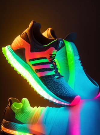 Sneakers with multicolored neon lights on a dark background