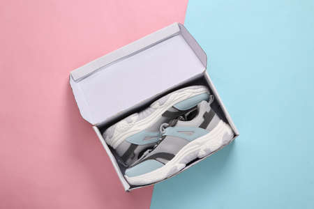 New sports sneakers with box on blue pink pastel background