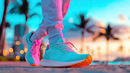 Brightly colored sports shoes are worn during a sunset stroll on a beach pathway. The scene captures a vibrant blend of colors and a relaxed summer vibe.