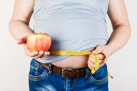 Male fat belly on white background, holding measuring tape and Apple. The concept of proper nutrition.