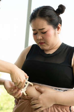 Fat asia girl with overweight checking out his weight, hand holding measurement tape on her belly fat.woman diet lifestyle and build muscle concept.