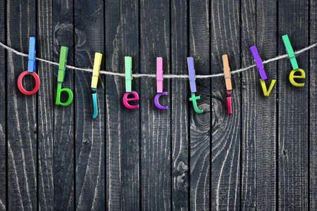 Objective word hanging on clips and wooden wall