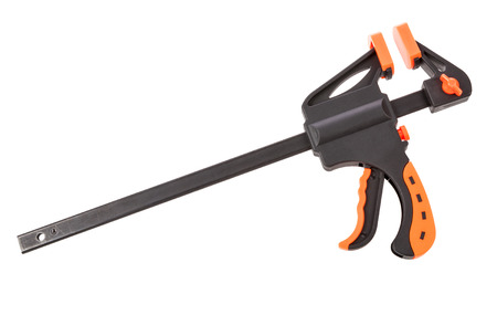 Plastic spring clamp isolated over white background. Equipment for woodworking, carpentry and other handiwork.