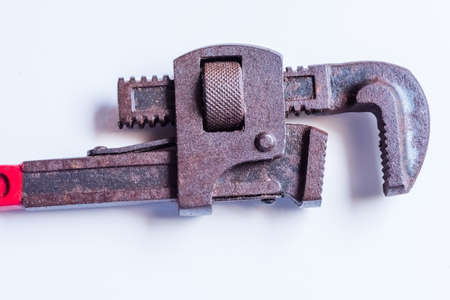 Closeup of rusted pipe wrench hand tool in isolated background