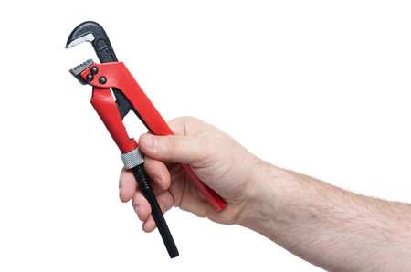 Close up of hand with iron red and black wrench isolated on white background with clipping path