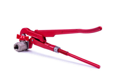 red gas wrench clamps the ball valve nut, object isolated on white background, side view