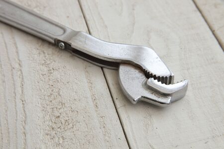 Adjustable wrench on wooden boards background.