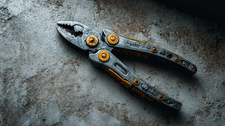 Detail of old pliers with rust resting on a textured concrete background. Captures craftsmanship and aging.