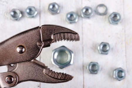 Top view of adjustable universal pliers for repair and assorted nuts on dark rusty background with copy space