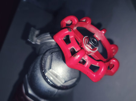 Close-up shows a red handle attached to a metallic valve with soft lighting, creating an industrial, utilitarian mood that could illustrate maintenance or engineering concepts.