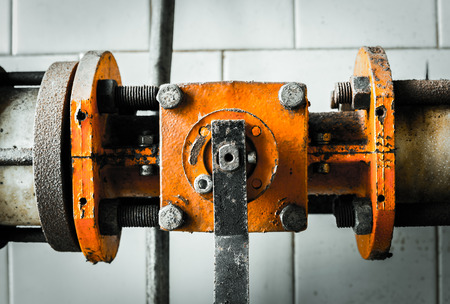 Close-up at pipeline valve which is using to control production process in the oil refinery plant. Selective focus at the valve handle wheel, Heavy industrial object photo.