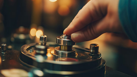 A close-up view of a person's hand making precise adjustments to machinery gears in an industrial workshop, with blurred background lights enhancing the atmosphere.