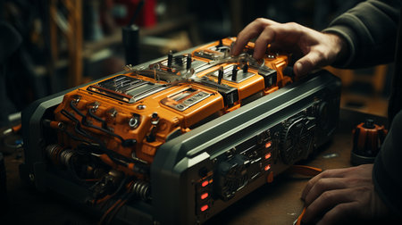 A close-up of hands adjusting dials and switches on a high-tech control panel