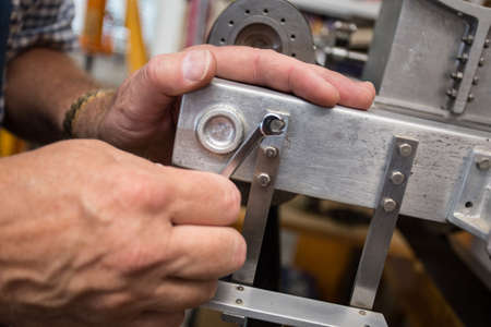 This close-up image captures a hand meticulously adjusting a mechanical component on precision equipment, showcasing attention to detail in a workshop.