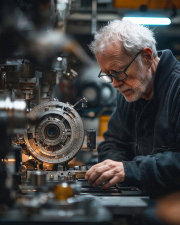 Focused craftsman repairing machinery in a vintage workshop setting.