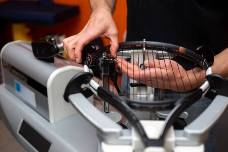 Stringing Machine. Close up of tennis stringer hands doing racket stringing in his workshop