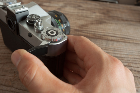 Old film camera, The wheel of choice shutter and shutter button, Close up view at 125 speed shutter, Selective focus, Vintage photo style