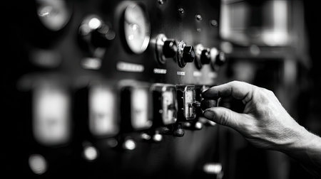 Capturing the essence of vintage machinery, this black and white image features a hand adjusting a control knob, emphasizing tactile engagement.