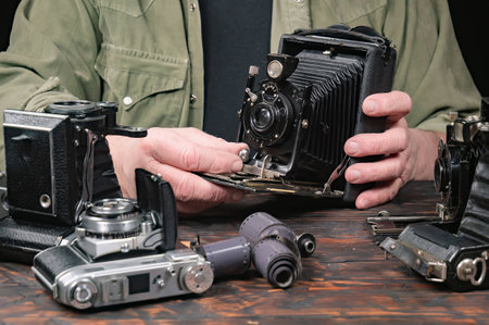 Beautiful well-groomed female hands take a photo on an old camera. Close-up.