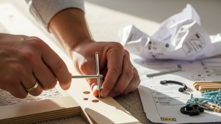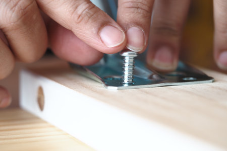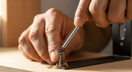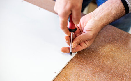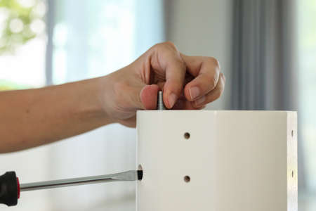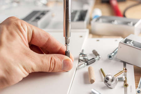 Close up of a man's hands using a screwdriver to assemble a furniture