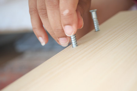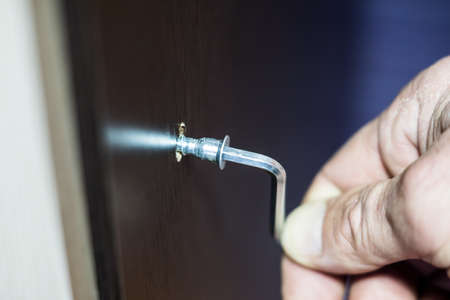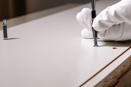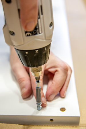 Furniture assembly. A worker fastens the parts of a bed using a confirmat. Close-up.