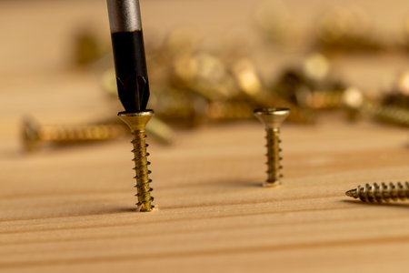 screwdriver and screws on a wood board, golden screws for construction, board and metal screws with a screwdriver for mounting, close up