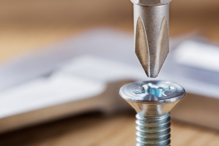 Screw being driven into a wooden board by a drill bit in a tight close-up. Hands-free fastening concept with clean background blur.