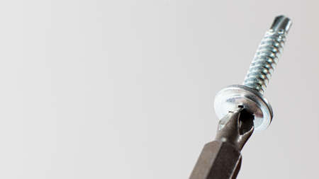 Self-cutters and screwdriver on a gray background with space for text. Screw with thread - fasteners for construction, tools and accessories for repair