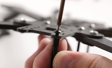 Tightening screws into carbon body of fpv DIY copter, close up view