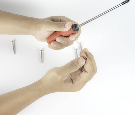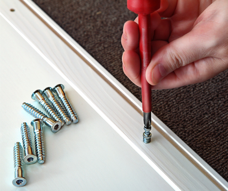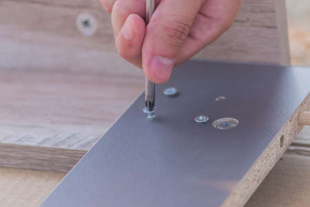 Hand holds cruciate screwdriver with a red handle, screwing wood dowel is a wooden panel, covered with a white stain On the panel are furniture screws