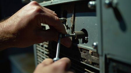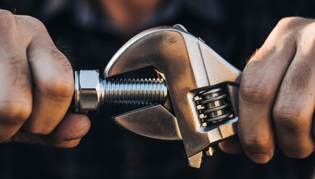 Close-up shot of a man's hands using a wrench to tighten a bolt on old, rusty machinery outdoors in sunlight. The image depicts skilled manual labor, industrial repair, and problem-solving. Focus on detail and texture showcases vintage technology and engineering. Ideal for themes of construction, DIY, and maintenance.